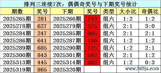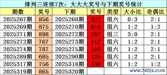 上期转头:陈列三2025319期奖号为:865。类型:组六,奇偶:偶偶奇,大小:大大大。